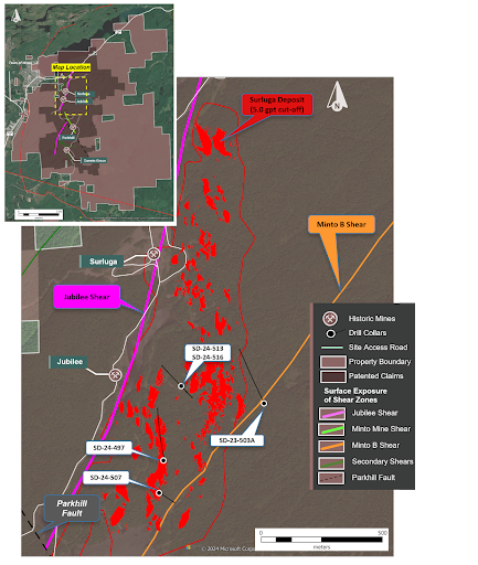 - 2.39 grams per tonne (“g/t”) gold over 39.07 m, including 7.99 g/t gold over 6.99 m in SD-24-497 in the Jubilee Shear System.