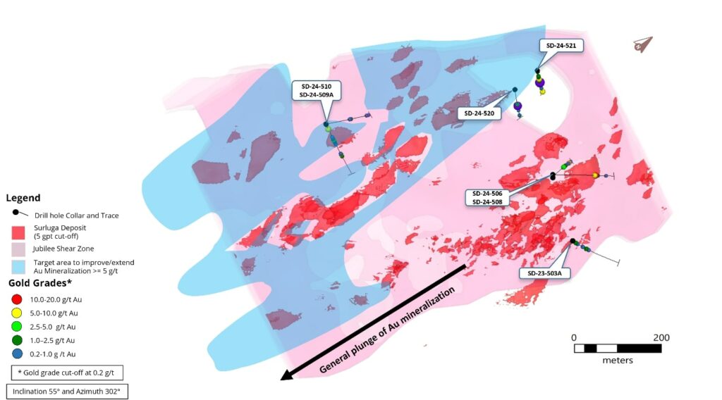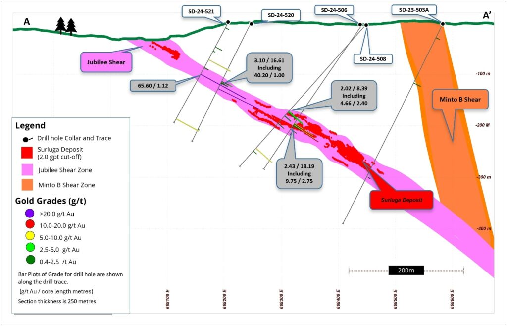 - 65.60 g/t gold over 1.12 m and 4.00 g/t gold over 2.20 m, including 7.47 g/t gold over 1.10 m in SD-24-521