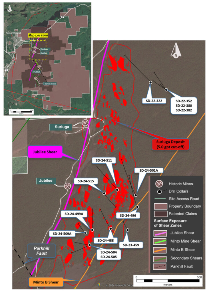 - 0.73 g/t gold over 9.57 m, including 2.41 g/t gold over 1.09 m within the Minto B Shear in SD-24-496