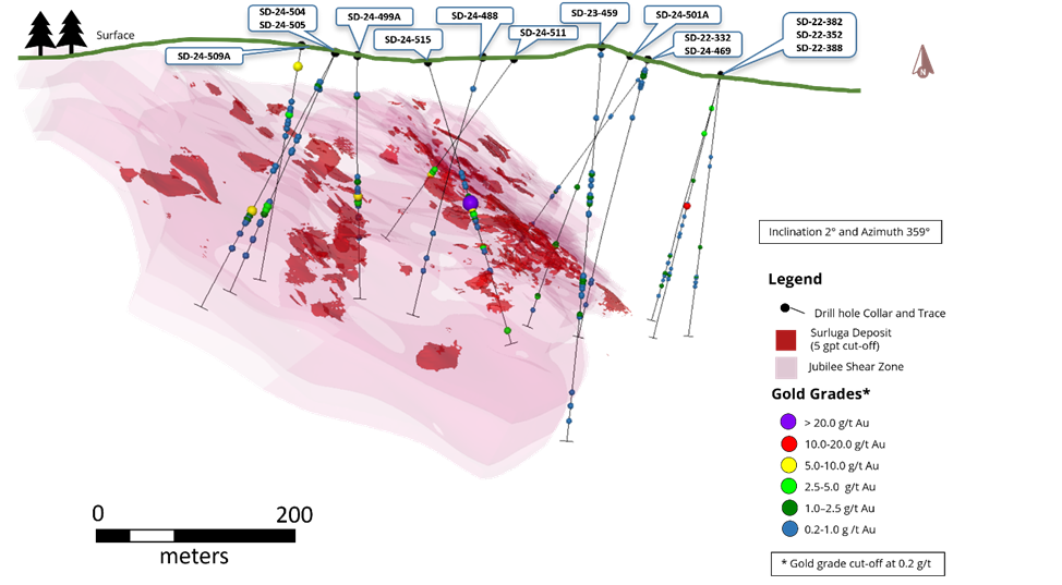 - 2.21 g/t over 13.27 m, including 7.59 g/t gold over 0.88 m in SD-24-499A within the Jubilee Shear System