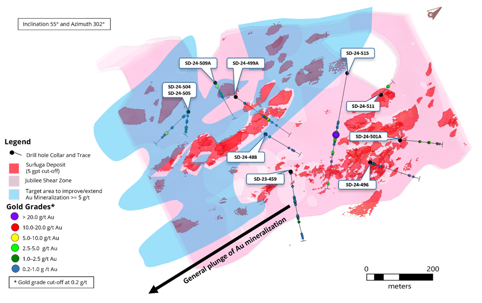 - 5.58 grams per tonne (“g/t”) gold over 18.44 m, including 6.18 g/t gold over 1.11 m, and 72.20 g/t gold over 0.88 m in SD-24-515 within the Jubilee Shear System