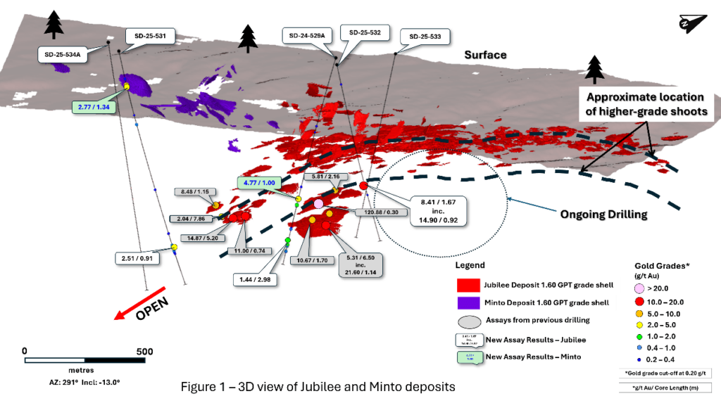 We are pleased that the initial drilling has already defined gold mineralization well outside of the 2024 mineral resource estimate (“MRE”) in the faulted southern extension of the Jubilee Shear, down-plunge and now in a parallel shoot at depth. We are continuing to test this newly discovered shoot up-plunge in the area beneath the mineral resource pit shell where no previous drilling has ever been completed.”