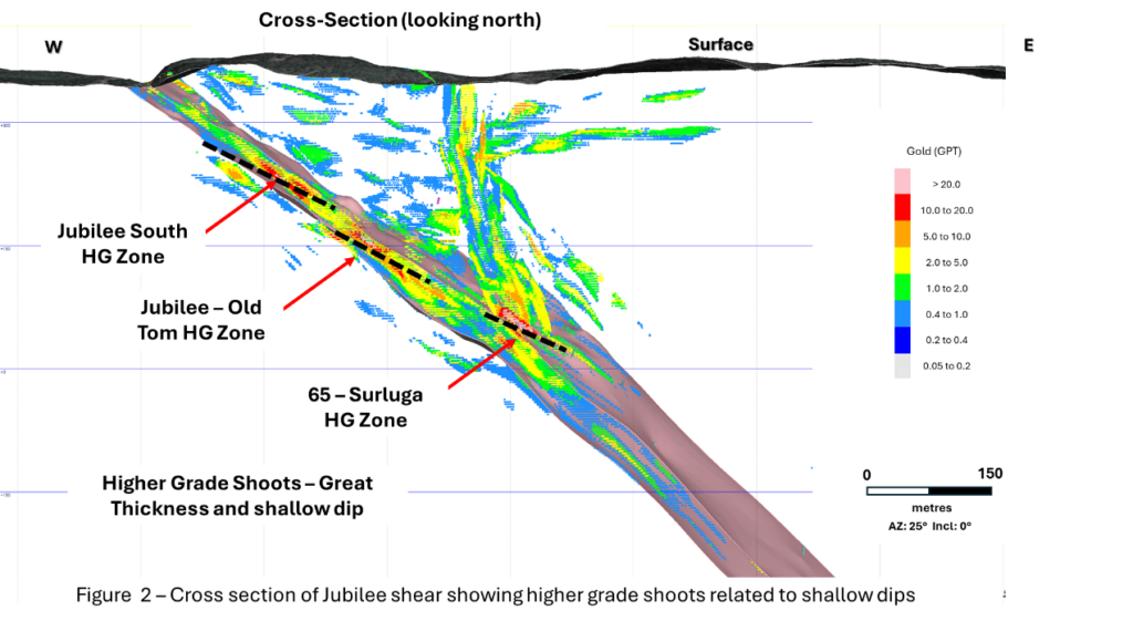 Figure 2 – Cross section of Jubilee shear showing higher-grade shoots related to shallow dips