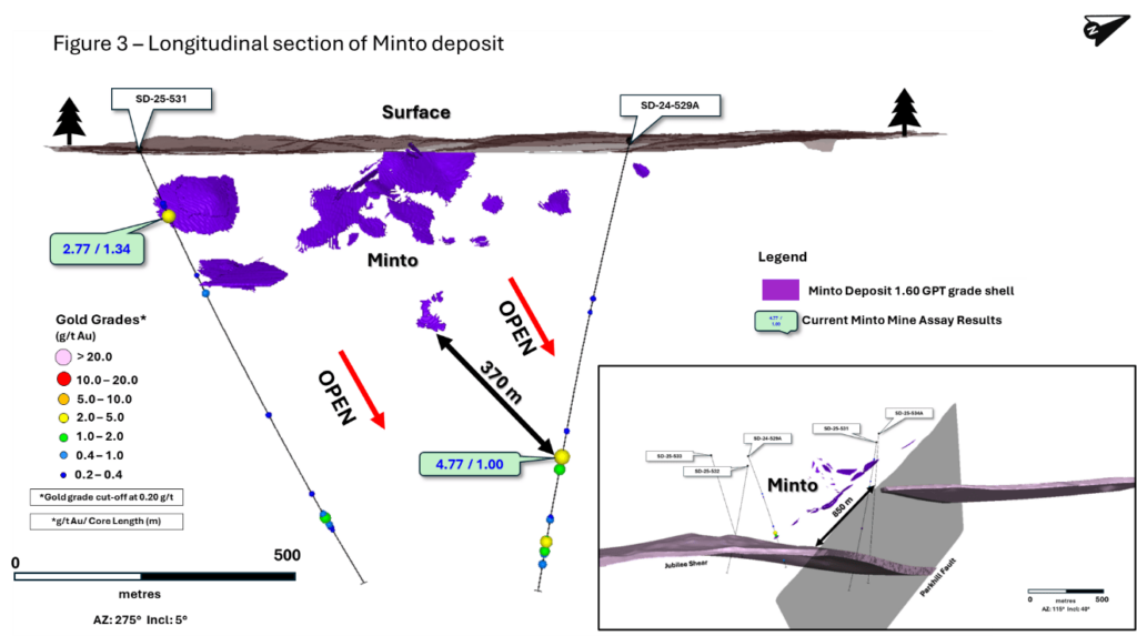 - Shallow intersection of 2.77 g/t Au over 1.34 m down-plunge of the southernmost extension of the Minto Deposit opening the zone for additional exploration toward the historical Parkhill Mine